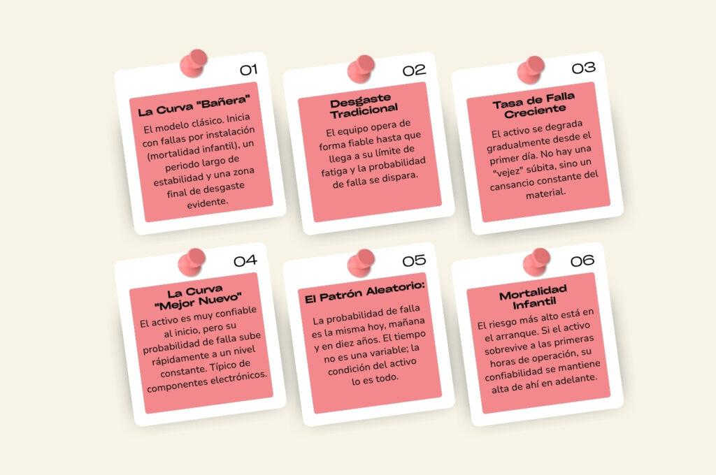 Ahora que conoces la ciencia detrás de la falla, ¿puedes identificar visualmente cada patrón? Un buen gestor de activos debe reconocer estas curvas de inmediato para asignar la estrategia correcta.